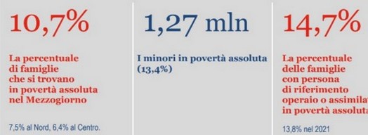L’Istat nel mese di giugno, nell’ambito delle statistiche sulla povertà, ha informato che nel 2021, erano in condizione di povertà assoluta poco più di 1,9 milioni di famiglie (7,5% del totale da 7,7% nel 2020) e circa 5,6 milioni di individui (9,4% come l’anno precedente). Pertanto, secondo l’Istat, la povertà assoluta conferma sostanzialmente i massimi storici toccati nel 2020, anno d’inizio della pandemia dovuta al Covid-19. Per la povertà relativa l’incidenza sale all’11,1% (da 10,1% del 2020) e le famiglie sotto la soglia sono circa 2,9 milioni (2,6 milioni nel 2020). Un altro elemento messo in evidenza dall’Istat è il peggioramento della condizione delle famiglie con maggior numero di componenti.