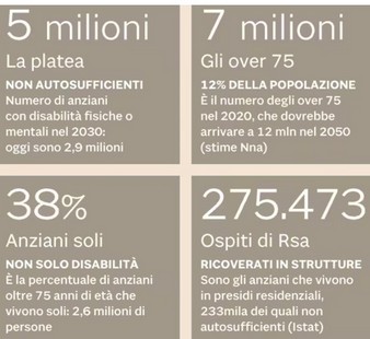 Gli over 65 in Italia sono 13,8 milioni, il 23% della popolazione. Nel 2050 si stima che arriveranno a sfiorare i 20 milioni (34% della popolazione). Gli anziani non autosufficienti, cioè con disabilità fisiche o mentali che ne determinano la dipendenza da altre persone nella vita quotidiana, sono 2,9 milioni e il numero di anziani non autosufficienti raddoppierà fino a quasi 5 milioni entro il 2030.